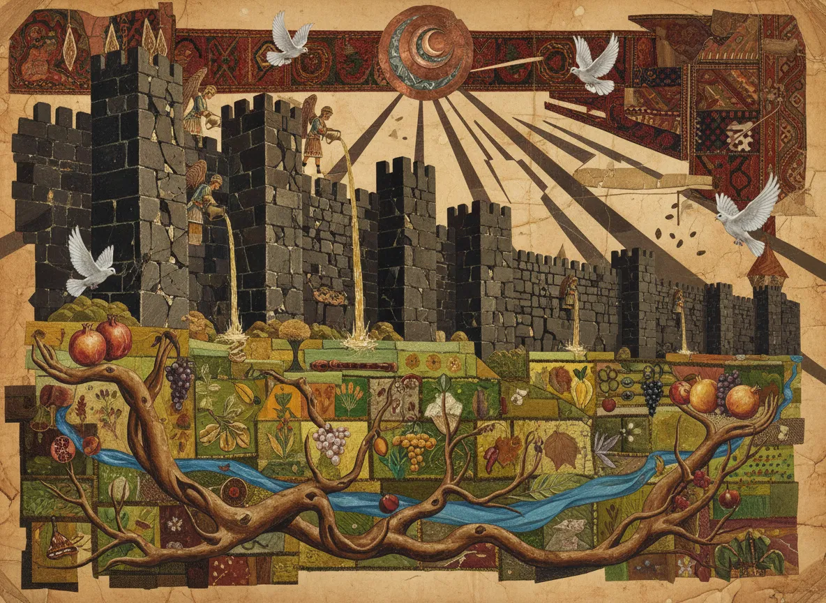 Величественная древняя крепость с базальтовыми стенами и плодородными садами Хевсель, демонстрирующая сельскохозяйственное наследие.